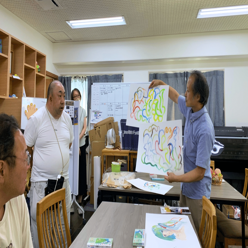 「思い切りのある構図がいいですね」「色の重なりがとてもきれいです」と、一人ひとりの作品に対して温かい言葉をいただき、メンバーさんも誇らしそうに作品を見つめていました。