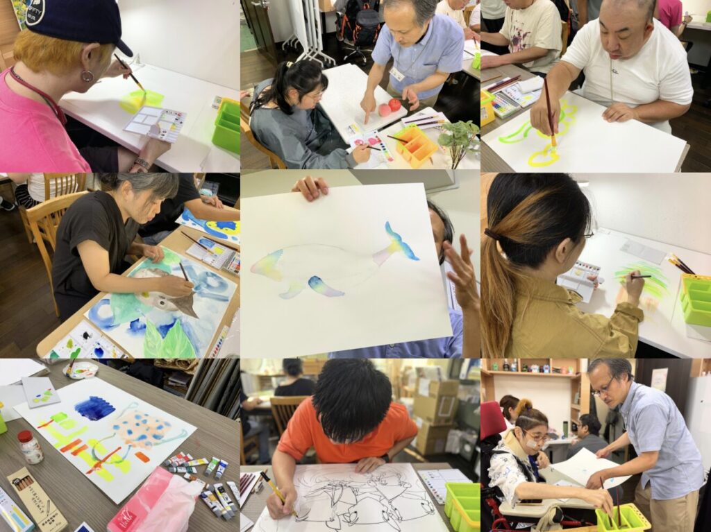 中には「グラデーションをきれいに出すコツはありますか?」「水彩画ならではの色の抜き方を教えてください」と積極的に質問するメンバーさんも。