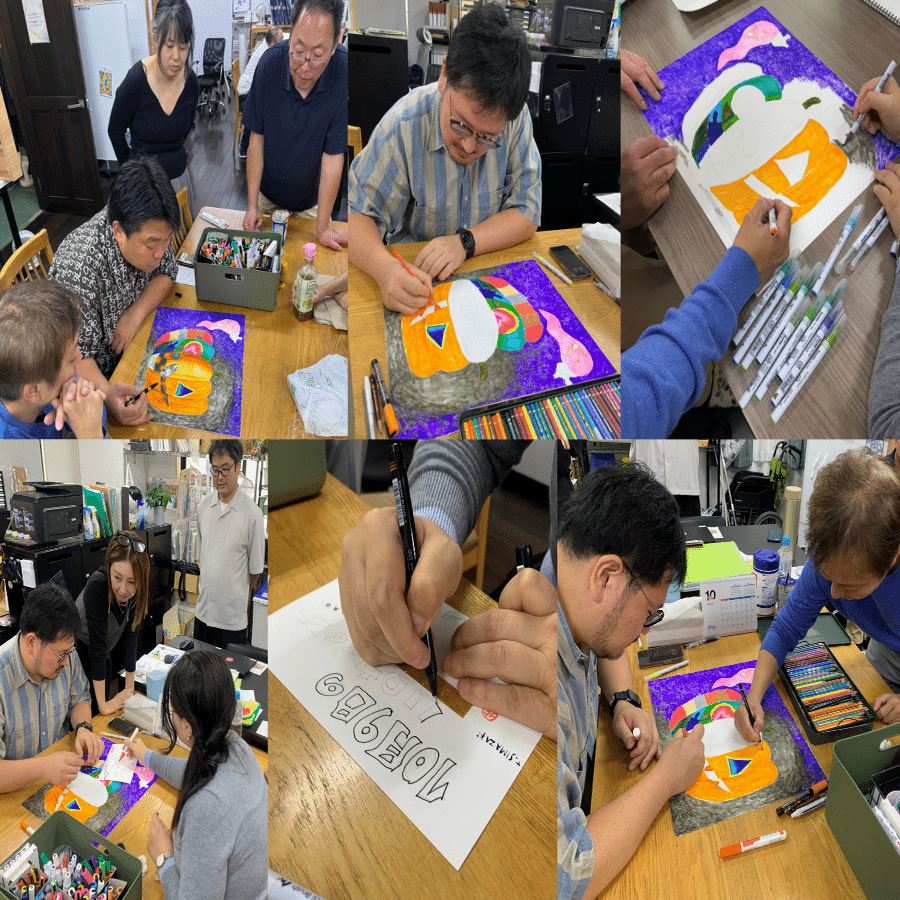 イラストが得意なメンバーさんが大きなパンプキンの下書きを描いてくれて、パンプキンの中や周りをパーツごとに分け、塗り絵のように色をつけていきました。