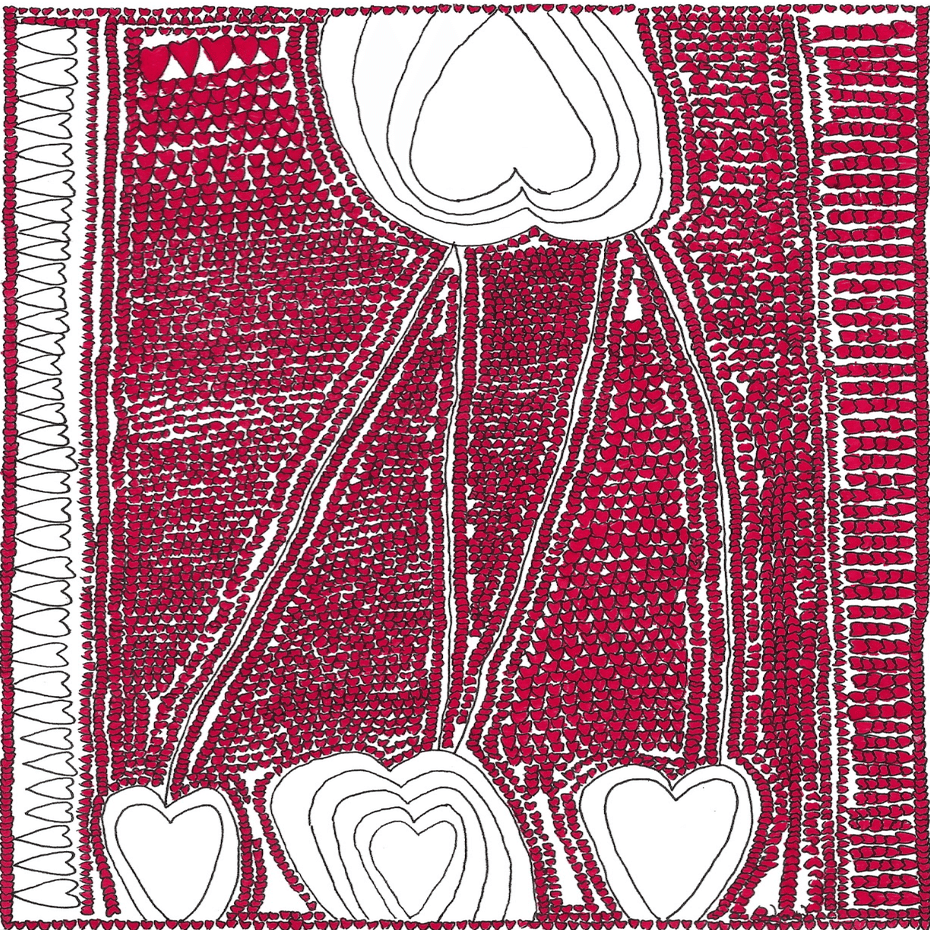 赤と黒のペンを使い、画用紙の中にリズムよく描かれる、たくさんのハート。